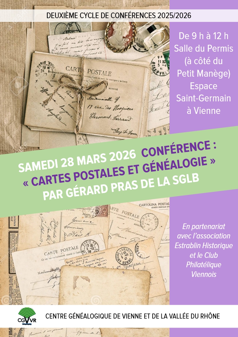 Conférence : « Cartes postales et généalogie » par Gérard Pras Et si vous faisiez la généalogie d’un personnage aperçu sur une carte postale ? Ou bien préférez-vous illustrer votre propre généalogie avec des cartes postales ? Gérard Pras, administrateur de la SGLB (Société Généalogique du Lyonnais et du Beaujolais) et conférencier confirmé, vous proposera […]